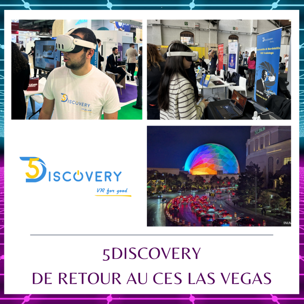 Back at CES 🚀 Pour la 2e année, 5Discovery était présent au CES Las Vegas, au cœur des grandes tendances 2026: IA, robotique, mobilité verte, santé et cybersécurité. Dans un environnement ultra-tech, nous portons une conviction forte : utiliser la VR et l’IA pour remettre l’humain et les compétences au centre de l’innovation.