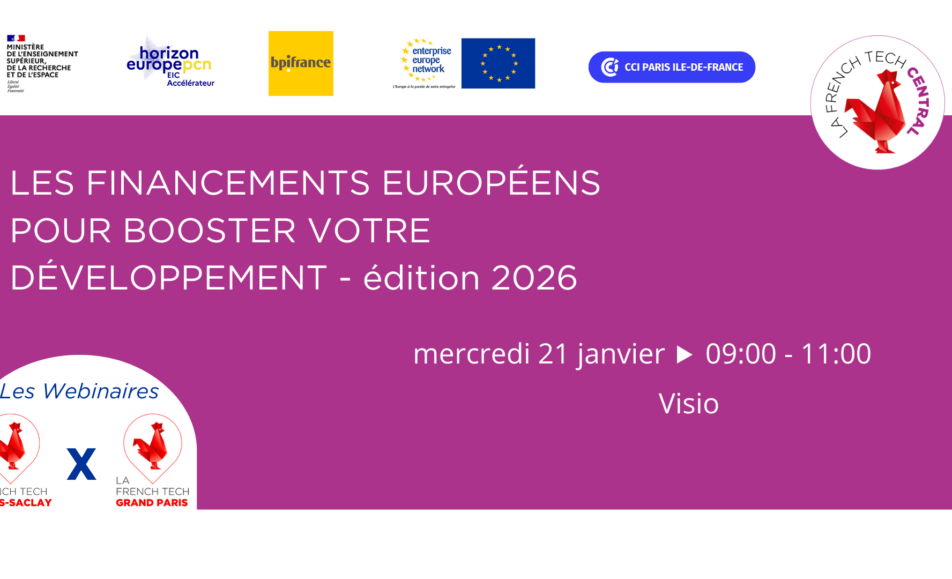 La French Tech Paris-Saclay et La French Tech Grand Paris sont ravies de vous accueillir pour leur Webinaire exclusif 100% Financement Européens ! Vous cherchez des opportunités de financement? Le mercredi 21 janvier rendez-vous à 09h00 en ligne pour découvrir...