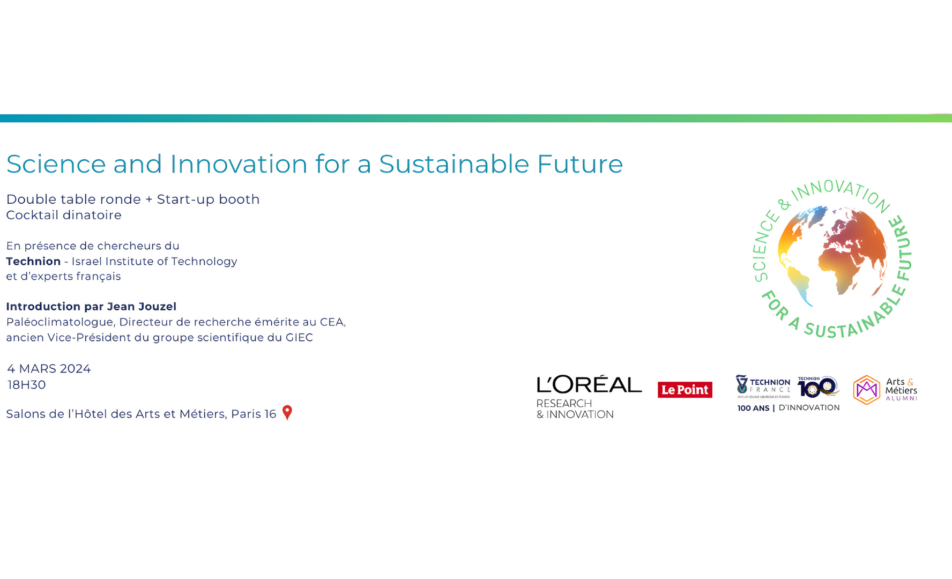 Le Technion France organise une double table ronde intitulée ‘Science and Innovation for a Sustainable Future’, en collaboration avec ‘Arts et Métiers Alumni’. L’événement se déroulera dans les Salons de l’Hôtel des Arts et Métiers, à Paris, le 4 mars 2024, à partir...