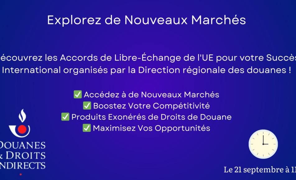 Participez à un webinaire organisé par la Direction régionale des douanes le jeudi 21 septembre 2023 à 11h pour en savoir davantage sur les accords de libre-échange de l'Union européenne.