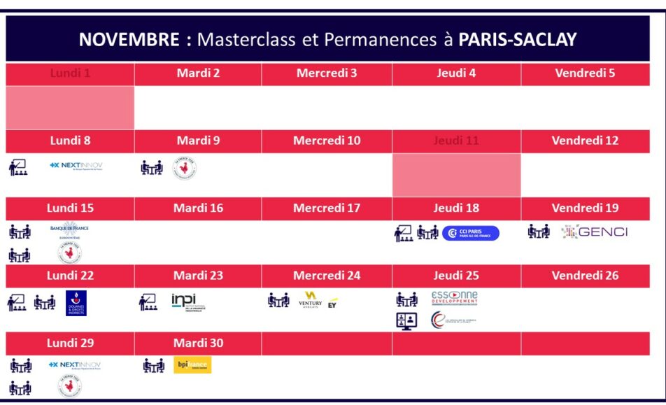 Lundi 8 novembre : Banque Populaire Val de France (BPVF) 11h45-12h30 Webinaire "présentation du programme d’accompagnement NEXTINNOV by BPVF » @ visio Inscription ICI Mardi 9 novembre : La French Tech Paris-Saclay 9h00-18h00 Permanence one-to-one French Tech Paris-Saclay @ Accélair Inscription...
