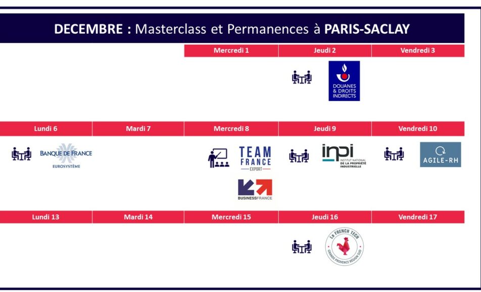 Jeudi 2 décembre : Douanes 10h-17h Permanence one-to-one @ Stop&work Saclay (Playground) Inscription ICI Lundi 6 décembre : Banque de France 14h00-18h00 Permanence one-to-one Banque de France @ Stop&work Saclay (Playground) Inscription ICI Mercredi 8 décembre : Business France 11h30-13h...